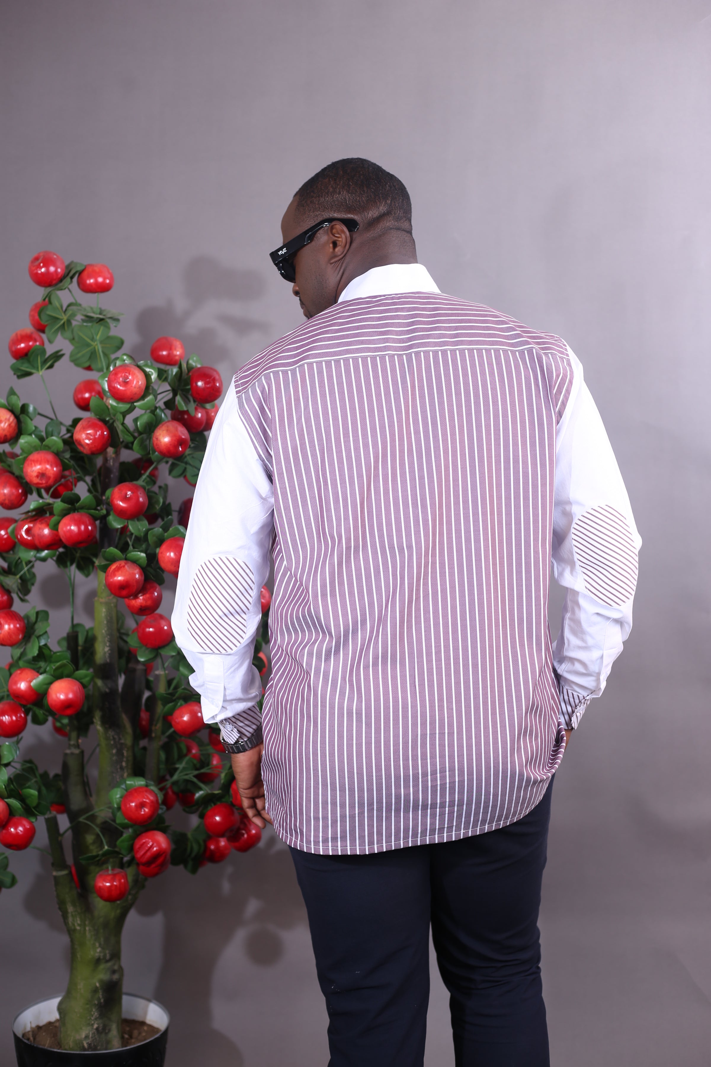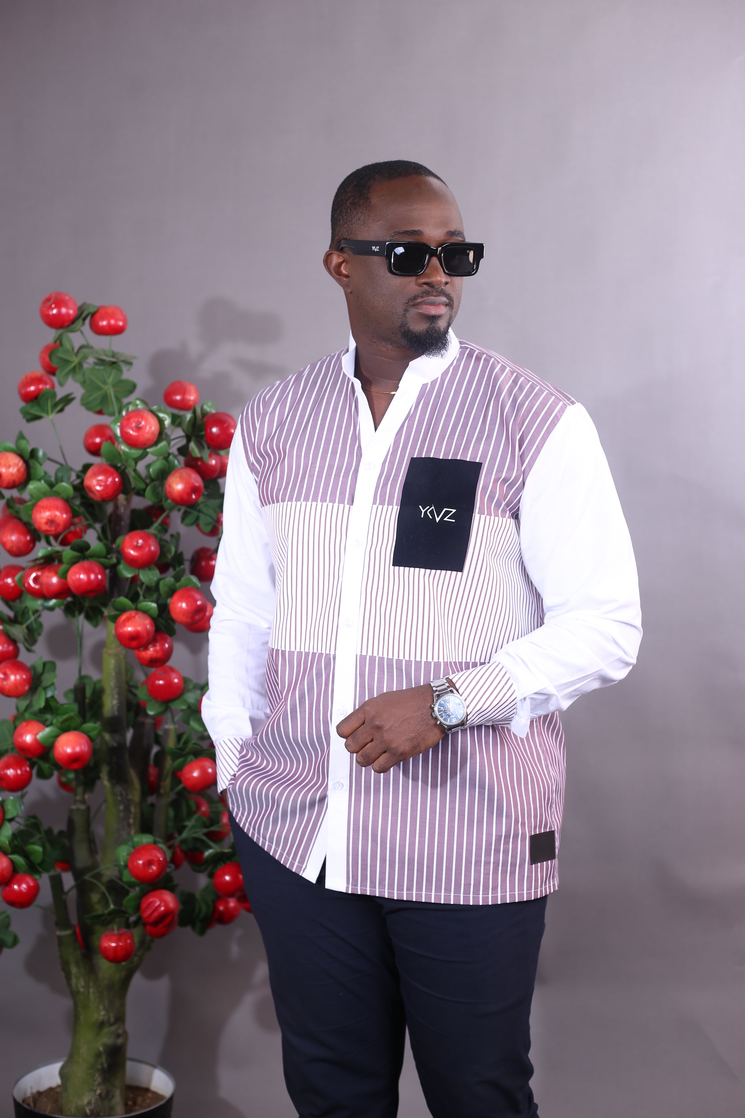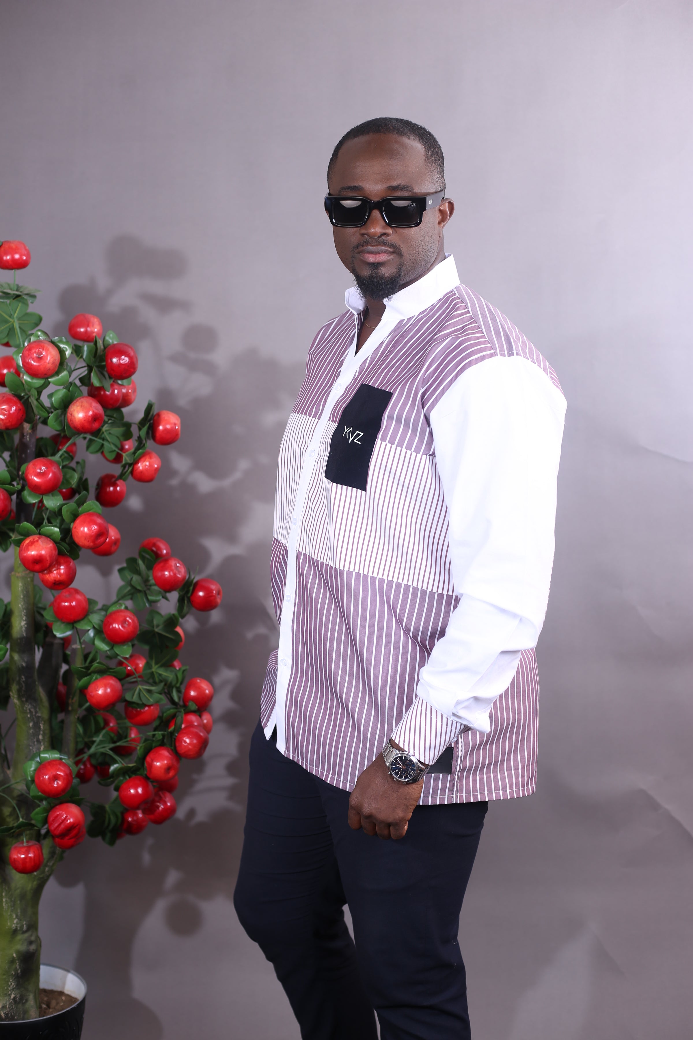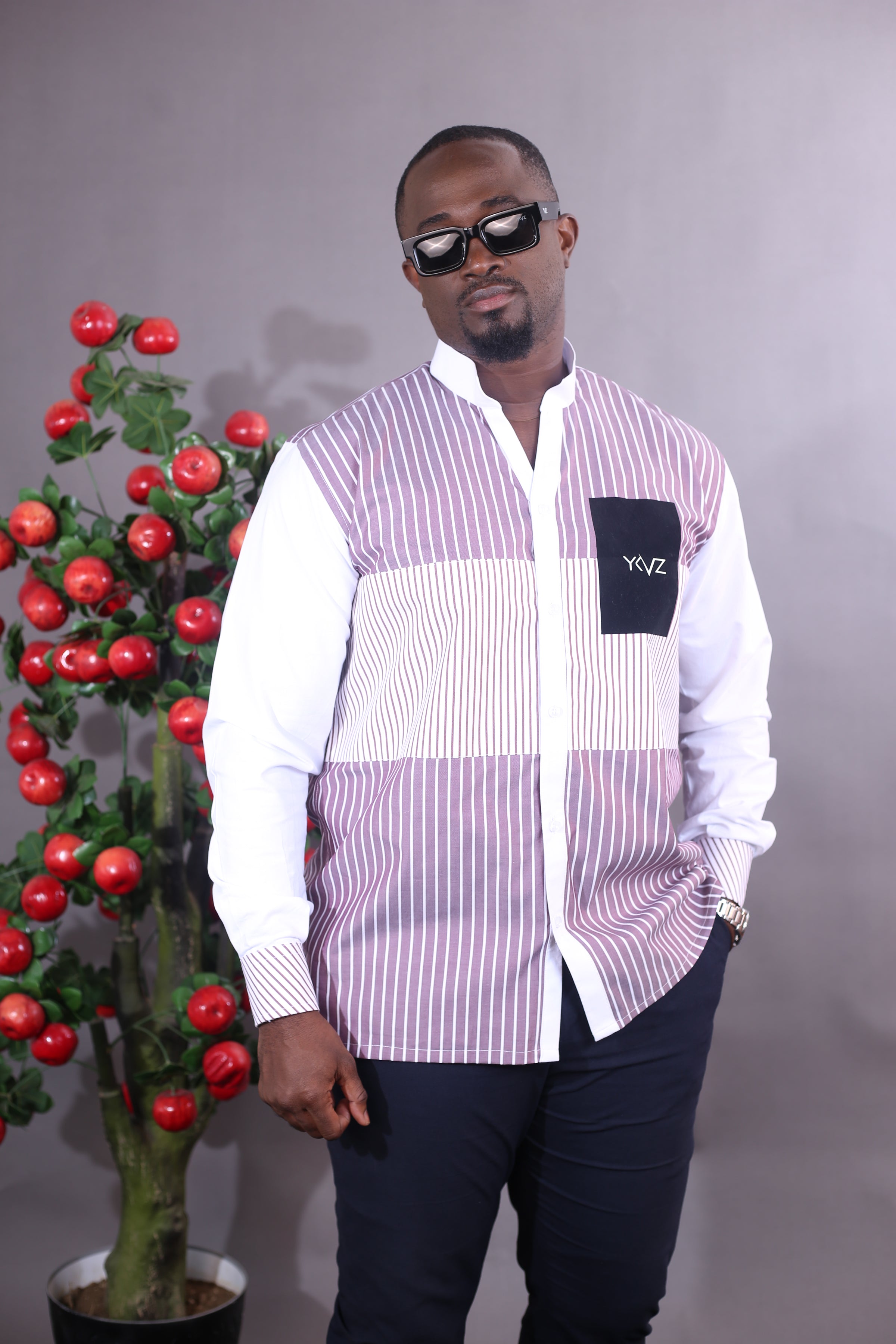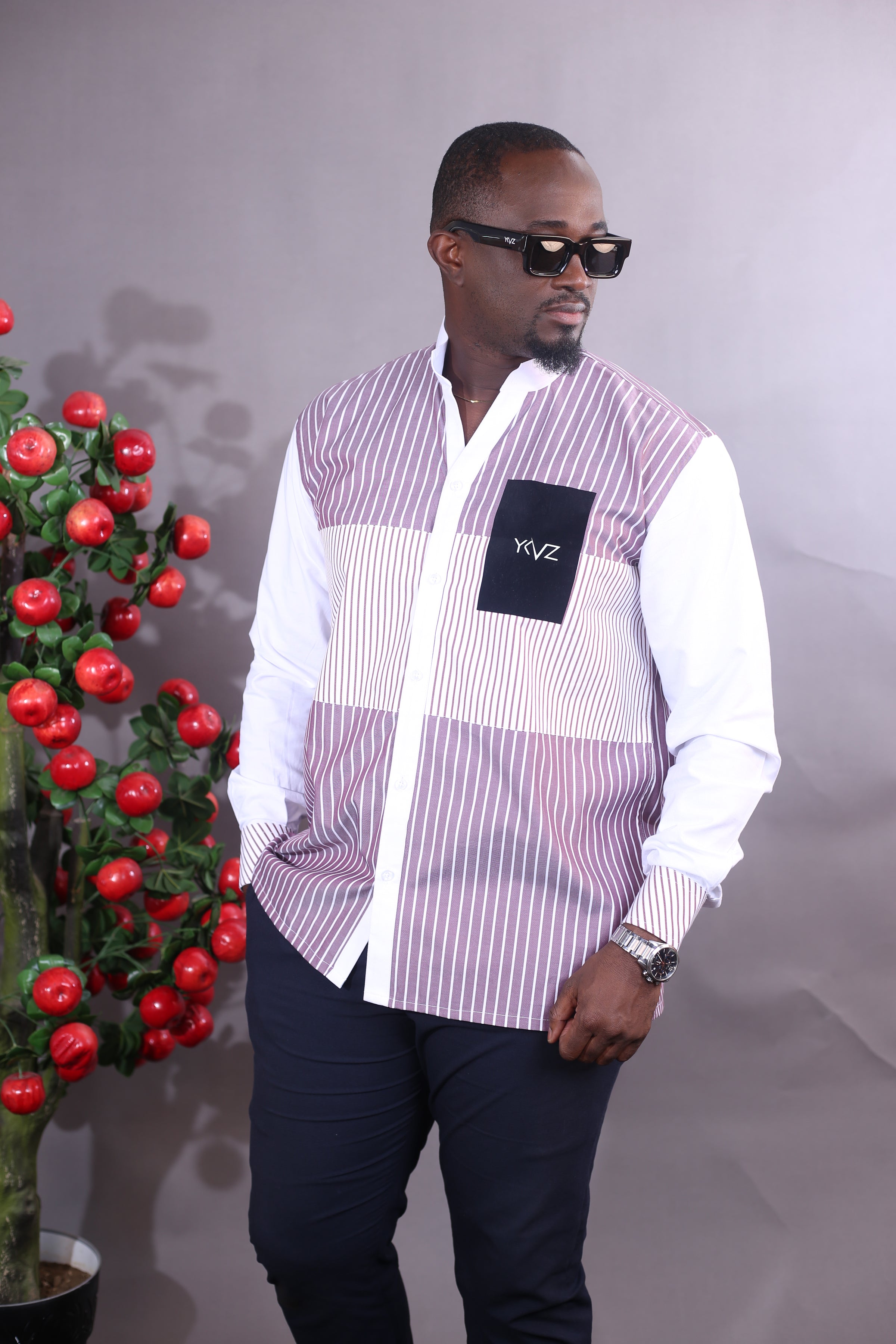 La structure raffinée des rayures rouge et blanches, l'intensité des tons rouge Bordeaux, et le logo noire YKVZ créent un équilibre visuel puissant, à la fois moderne et profondément africain. Une harmonie qui ne s'impose pas: elle s'affirme.