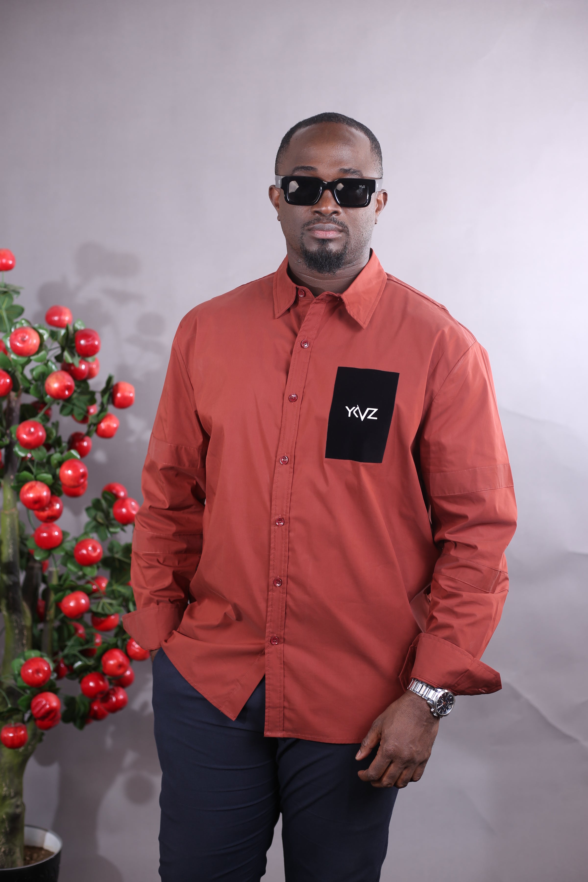 Chemise à manches longues en rouge bordeaux profond, au style sportif et affirmé. Confectionnée en coton texturé style dobby, elle adopte une coupe régulière et un col classique, pour un tombé confortable et structuré. Sur le devant, un motif graphique en velours noir apporte du contraste et de la matière, tandis que le logo signature YKVZ, imprimé en version phosphorescente, se distingue sur la poitrine gauche. Une pièce pensée pour ceux qui allient prestance et caractère.