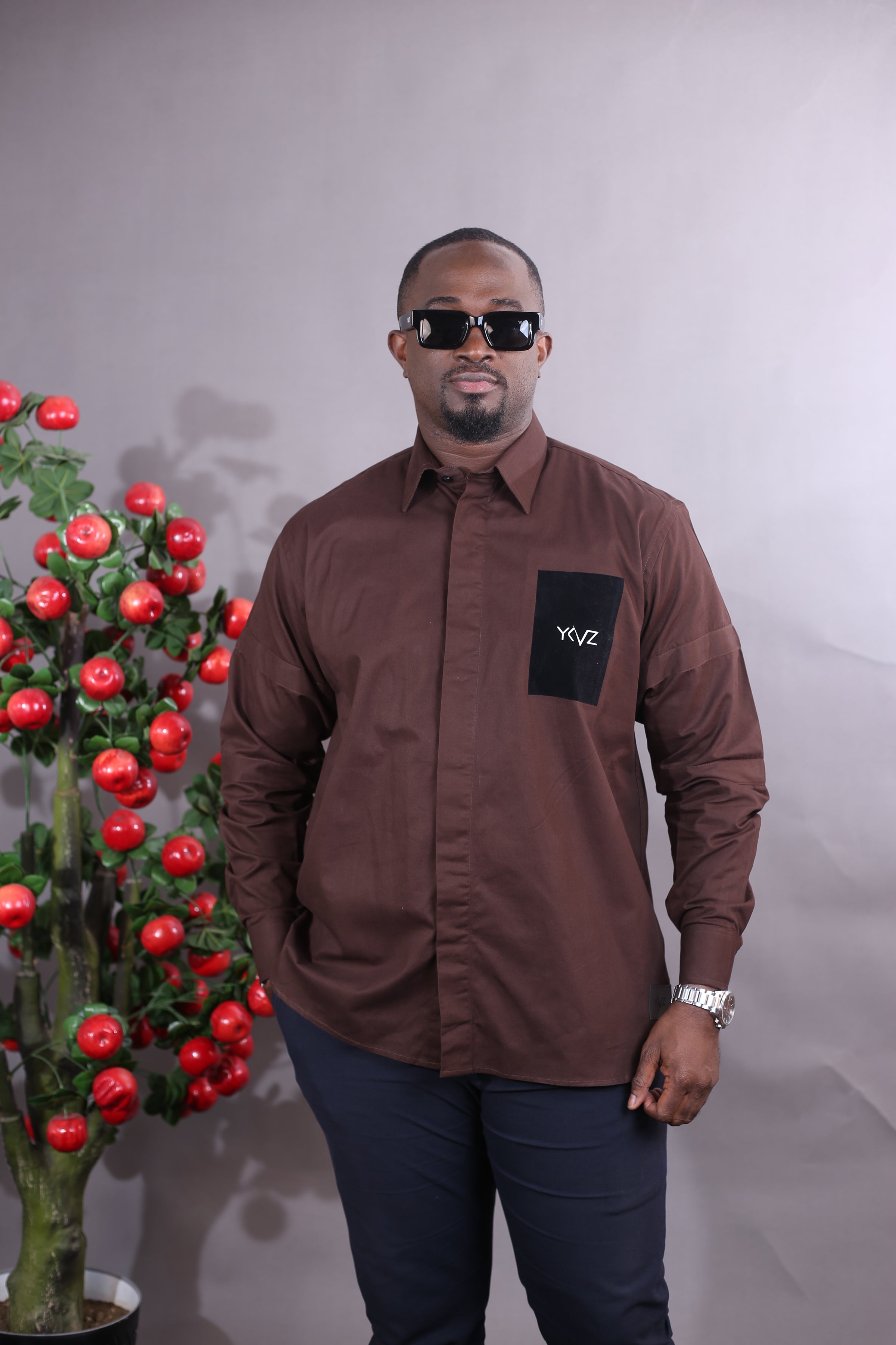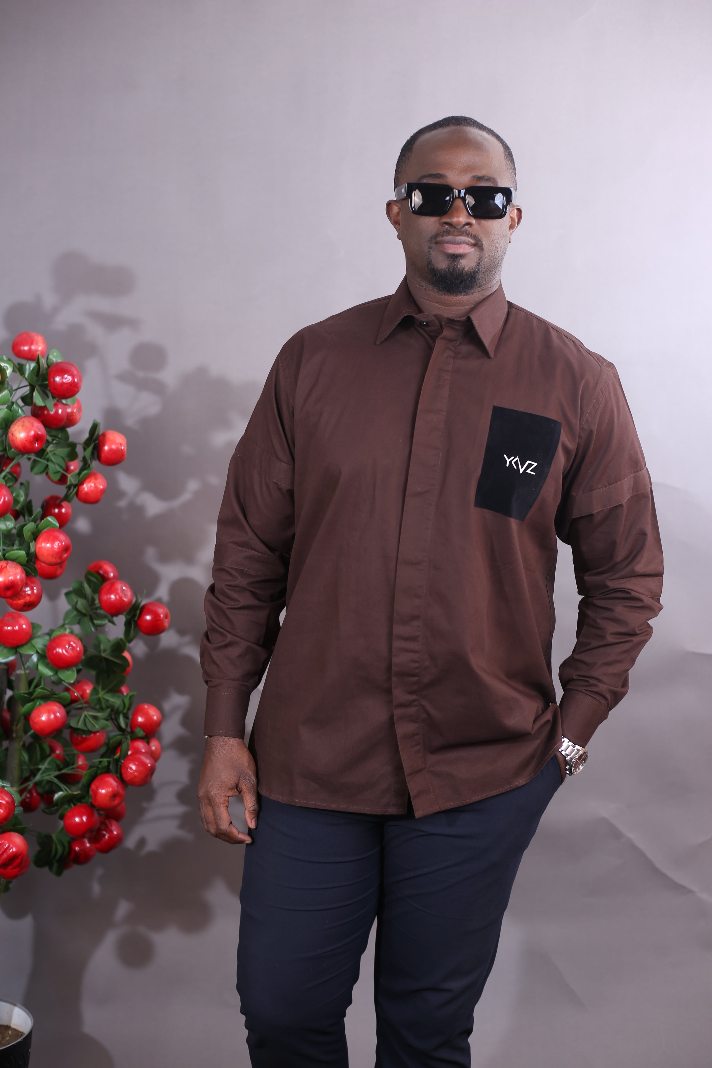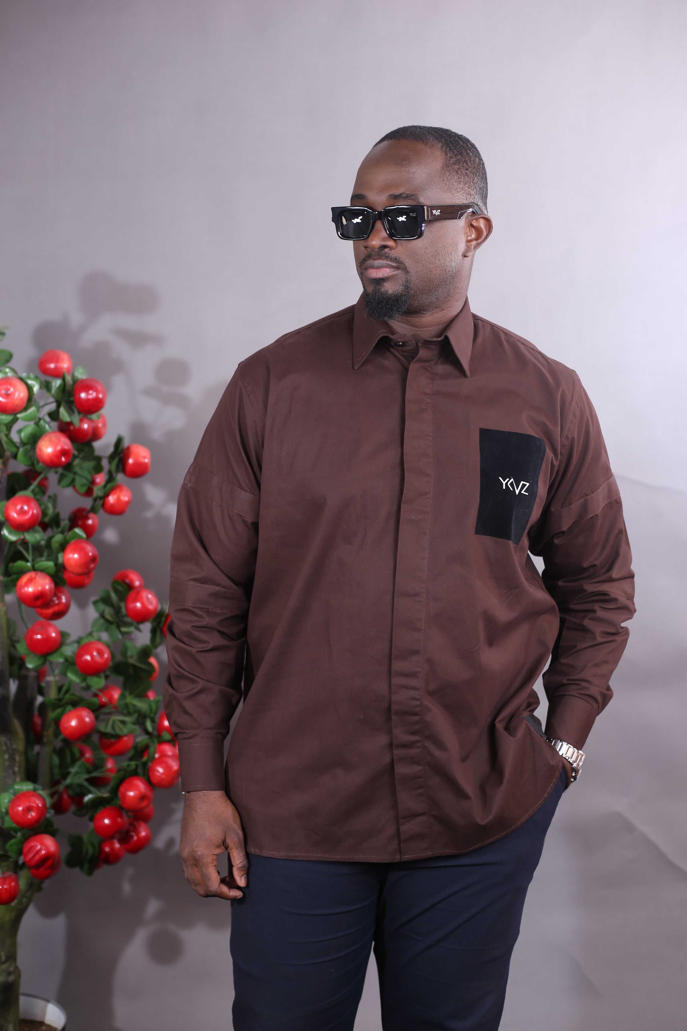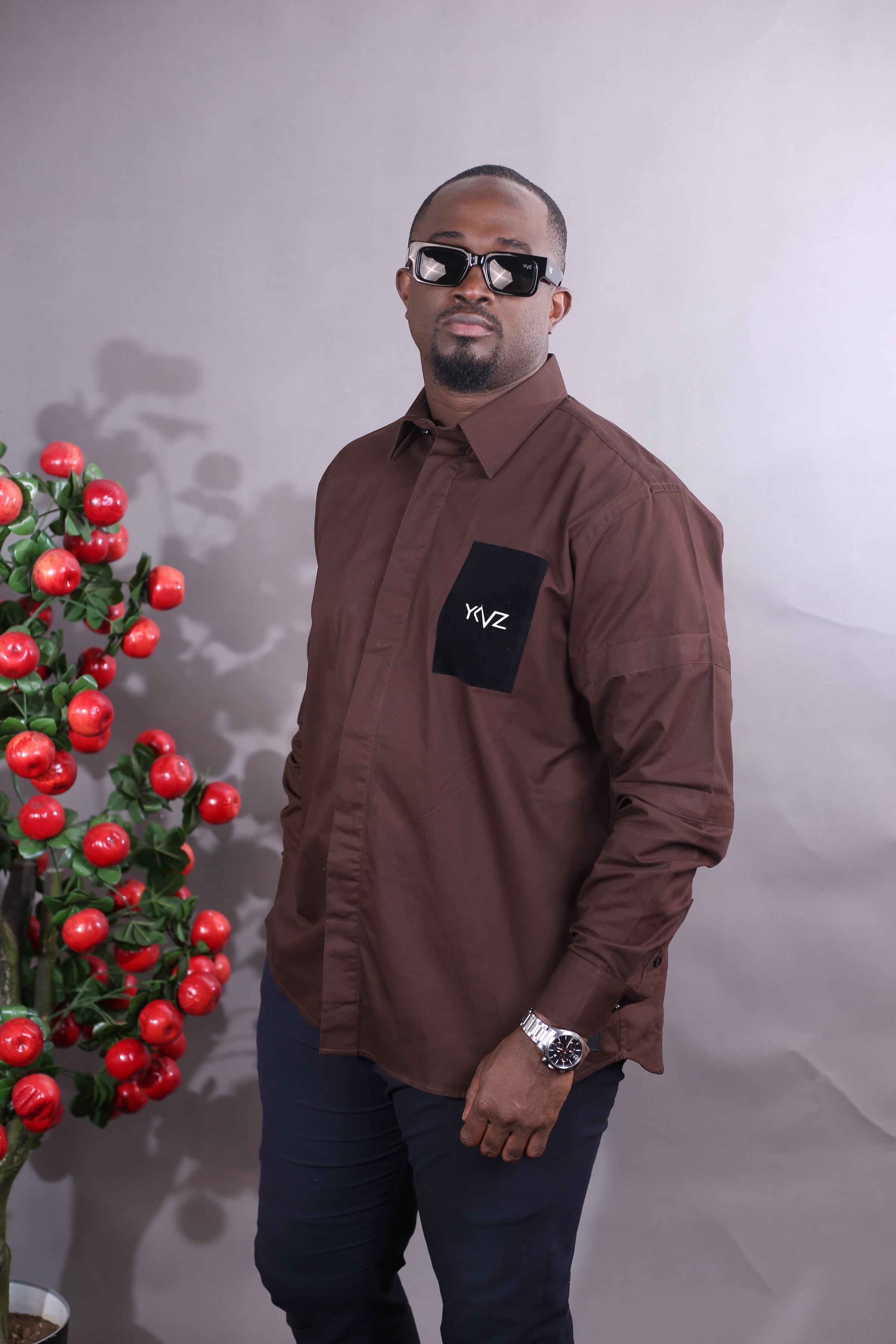 Déclinaison de la chemise classique YKVZ, cette version en 100 % coton marron enrichit l’ADN de la Signature Line avec une touche d’autorité stylisée. Elle conserve une coupe droite, un col classique, un bas arrondi et des manches longues, dans un esprit sobre et structuré.